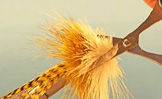 Select a bunch of deer hair twice the diameter of a kitchen match. Wrap it around the hook shank with 3 loose wraps. Tighten the thread tension and the hollow hair will flare. Secure with 5 tight wraps directly in front of hair. Push the bundle backwards to condense it.