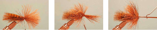 Take a bunch of deer hair the size of 2 match sticks and attach it to the hook with 3 loose thread wraps. Tighten the tension and the hollow hair will spin and flare around the hook shank. Secure with 5 tight wraps. Repeat this process 1 or 2 more times until the head area is full of spun hair. Secure with 5 tight wraps and whip finish. Place a drop of head cement in thread wraps.